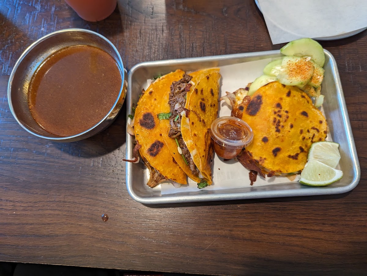 A very cute space with fun music and a lovely hostess. I tried the quest-birria taco combo (3 tacos and consommé) and couldn't be happier. Crispy taco shell, stuffed with tender beef and perfectly melty cheese. The combination of textures adorned with the warm, flavorful consommé was everything I could have asked for on a cold Winter evening. Looking forward to trying everything else on the menu!